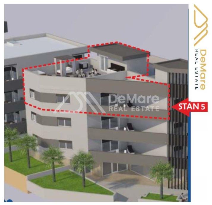 Prekrasan, luksuzan, moderan Penthouse apartman na atraktivnoj lokaciji, u blizini mora i plaže; zauzima polovinu etaže na 2. katu. Dnevni boravak je samo staklenom kliznom stijenom odvojen od natkrivene terase, na kojoj se mogu urediti razni sadržaji za boravak na otvorenom.