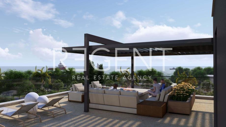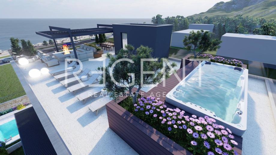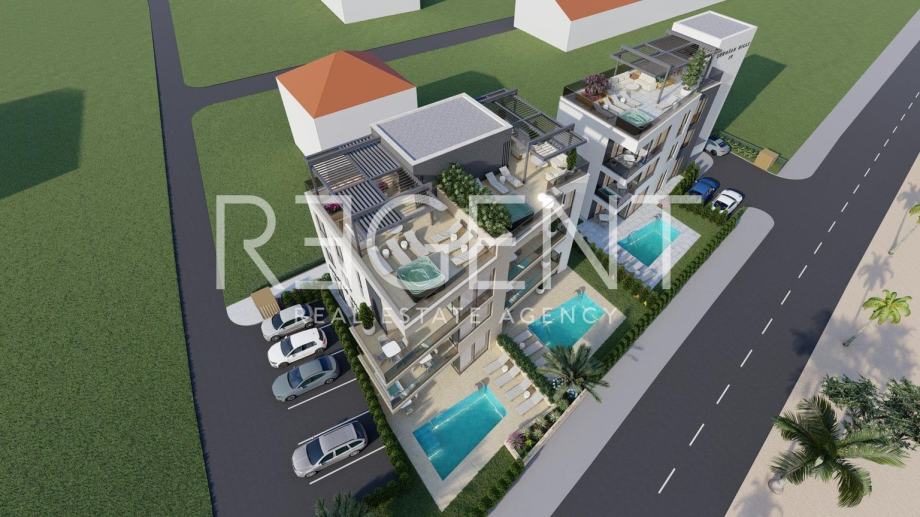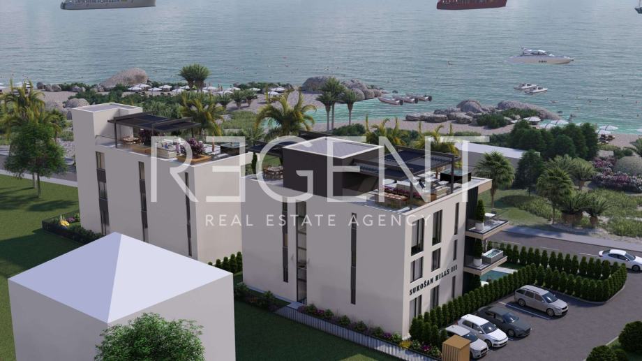 Posredujemo pri prodaji penthousea koji se nalazi na izvrsnoj lokaciji u Sukošanu, nedaleko od Zadra. Jedinstvena lokacija u prvome redu uz more čini ovaj stan idealnom investicijom za buduće ulagače u turističku djelatnost.Stan se nalazi na zadnjem katu zgrade u izgradnji, a sastoji se od dvije etaže. Prva se sastoji od hodnika ukupne netto površine 5,14m2, dvije kupaonice površine 3,38m2 i 4,85m2, open space prostora površine 28,44m2 koji obuhvaća dnevni boravak, kuhinju i blagovaonicu, tri spavaće sobe površina 10,31m2, 9,67m2 i 12,19m2, loggie površine 6,81m2 i balkona površine 3,81m2. Stan obuhvaća i stepenište površine 12,55m2 koje vodi na drugu etažu na kojoj se nalazi prostrana krovna terasa površine 23,28m2.Stan je opremljen klima uređajem i podnim grijanjem u kupaonici.Uz stan dolazi i vanjsko parkirno mjesto koje je uključeno u cijenu.Za više informacija, kontaktirajte našeg agenta na brojeve telefona: