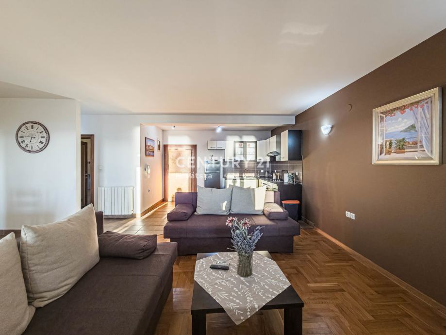 Neto površina stana iznosi 74,43 m2 dok sa pripadcima ima ukupno 123,19 m2 površine a sastoji se od 2 odvojene spavaće sobe od kojih jedna ima vlastitu kupaonicu, dodatna kupaonica sa wc i tuš kabinom, otvoreni prostor gdje se nalazi kuhinja sa blagovaonom i dnevnim boravkom sa izlazom na prostranu natkrivenu terasu površine 24,53 m2 sa koje se pruža predivan pogled na more. Prostrana terasa je velika prednost stanu gdje se može uživati u predivnom pogledu i opuštanju tokom cijele godine.