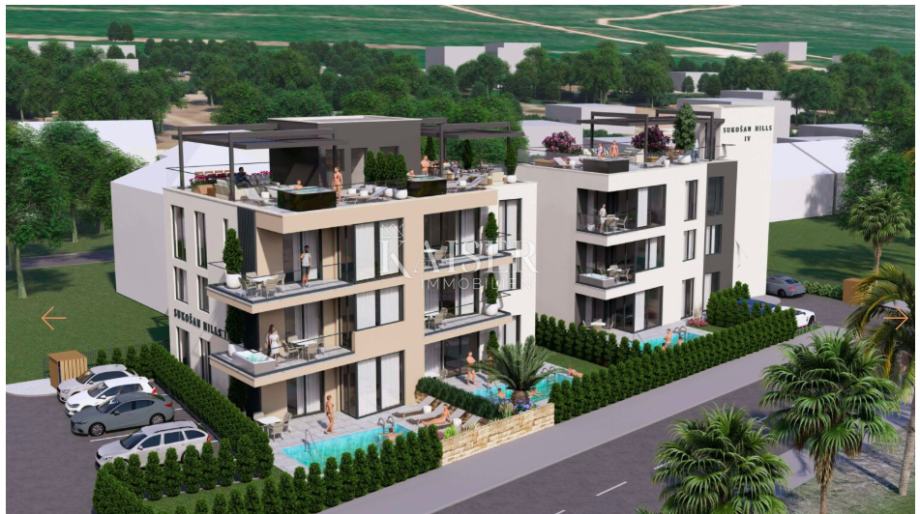 Zgrada je dizajnirana s naglaskom na eleganciju, privatnost i udobnost, a stanari imaju na raspolaganju niz premium sadržaja, uključujući privatne bazene u prizemnim stanovima i prostrane krovne terase s panoramskim pogledom. garažom, osiguravajući sigurnost i privatnost. U sklopu stambenog kompleksa, svaki stan dolazi s vlastitim parkirnim mjestom koje je uključeno u kupnju stana. Osim toga, postoji mogućnost dodatne kupnje mjesta u podzemnoj garaži, koja pruža dodatnu sigurnost i praktičnost vlasnicima stanova.