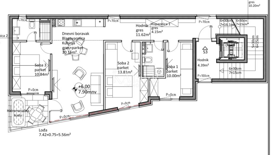 Ono što čini stan S03 posebno ekskluzivnim jest prostrana privatna krovna terasa površine 26,56 m2, koja budućim vlasnicima pruža potpunu slobodu uređenja i korištenja.