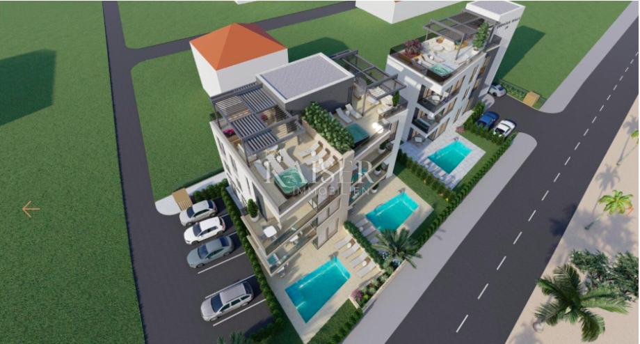Samo nekoliko koraka od kristalno čistog mora, smješten je luksuzni kompleks koji nudi ekskluzivnu priliku za život na Jadranskoj obali. Unutar ovog modernog kompleksa, u prizemlju zgrade s ukupno šest stambenih jedinica, nalazi se ekskluzivan dvosoban stan S02 s vlastitim bazenom. Ovaj jedinstveni stan predstavlja savršen spoj suvremene arhitekture, vrhunske udobnosti i opuštajuće mediteranske atmosfere.