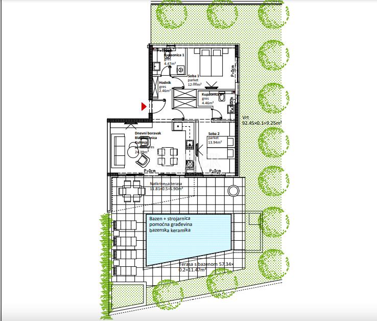Prava posebnost ovog stana je privatni bazen smješten u uređenom vrtu površine 92,45 m². Natkrivena terasa (11,81 m²) savršeno je mjesto za uživanje u jutarnjoj kavi, dok prostrana terasa s bazenom (57,34 m²) nudi obilje prostora za sunčanje, opuštanje i organizaciju ljetnih druženja na otvorenom. Ovaj vanjski prostor pruža osjećaj privatnosti i omogućuje život u skladu s mediteranskim načinom života.