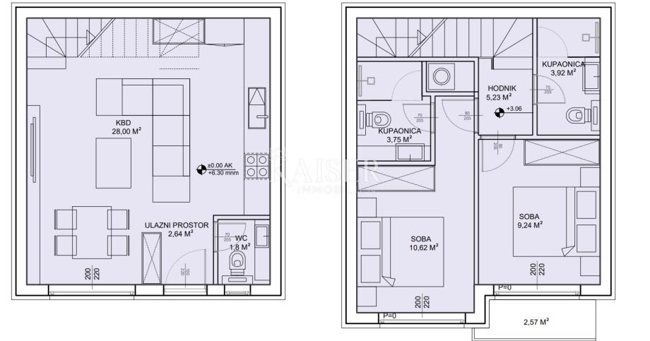 Na katu se nalaze dvije prostrane spavaće sobe (10,62 m² i 9,24 m²), svaka sa svojom kupaonicom (3,75 m² i 3,92 m²), što omogućuje dodatnu privatnost. Prostrani hodnik (5,23 m²) povezuje sve prostorije.
