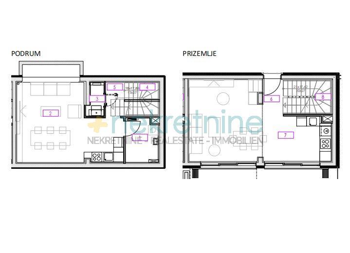 Predprostor, WC, strojarnica, stubište te “open space” prostor s kuhinjom, blagovaonicom i dnevnim boravkom.