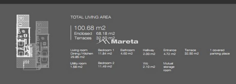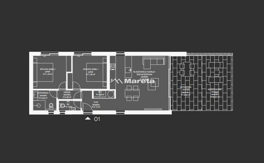 Sastoji se od: dvije spavaće sobe, dnevnog boravka + kuhinja + blagovaona, hodnika, predsoblja, ostave, kupaonice, wc-a i terase.