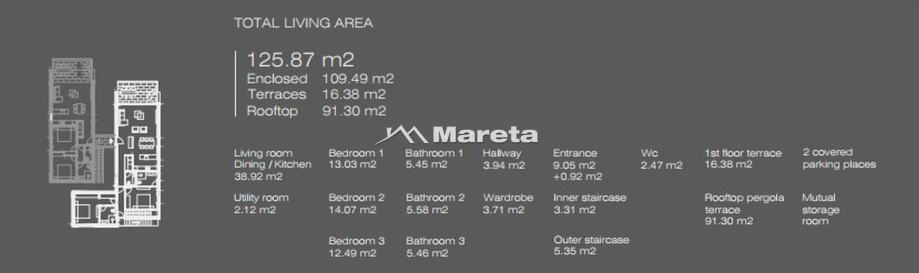 Posjeduje natkriveno parkirno mjesto i krovnu terasu od 91,30 m2.