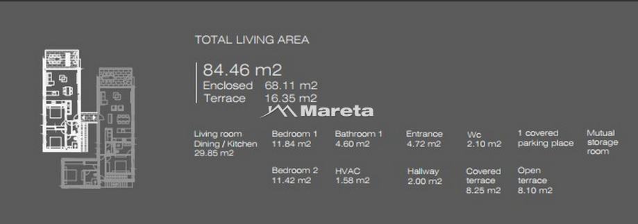 Sastoji se od: dvije spavaće sobe, dnevnog boravka + kuhinja + blagovaona, hodnika, predsoblja, ostave, kupaonice, wc-a i terase.