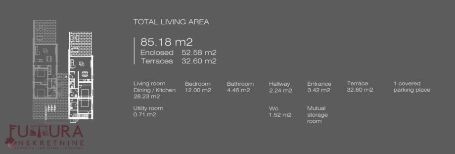 Sastoji se od: jedne spavaće sobe, dnevnog boravka + kuhinja + blagovaona, hodnika, predsoblja, ostave, kupaonice, wc-a i terase.