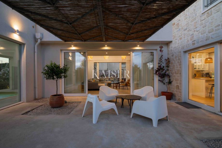 Između dnevnog boravka i wellness zone smještena je prostrana južna terasa lounge zona, savršena za druženja na otvorenom. Sa sjeverne strane nalazi se terasa opremljena pomičnim roštiljem, obje terase omogućuju fleksibilnost korištenja – bilo da se radi o ležernom obiteljskom ručku, večernjem roštiljanju s prijateljima uz zvukove klavira ili tihoj večeri uz svijeće. Položaj terasa omogućuje jednostavan pristup unutarnjim prostorijama ali i zadržava povezanost s prirodom koja je sveprisutna u ambijentu. Južna terasa djelomično je natkrivena lounge zona, prostire se na 37 m2, sjeverna terasa vanjska je blagovaonica djelomično natkrivena, prostire se na 39 m2.Terase se prirodno nastavljaju na dvorište površine 692m2, pažljivo uređeno mediteranskim biljem.