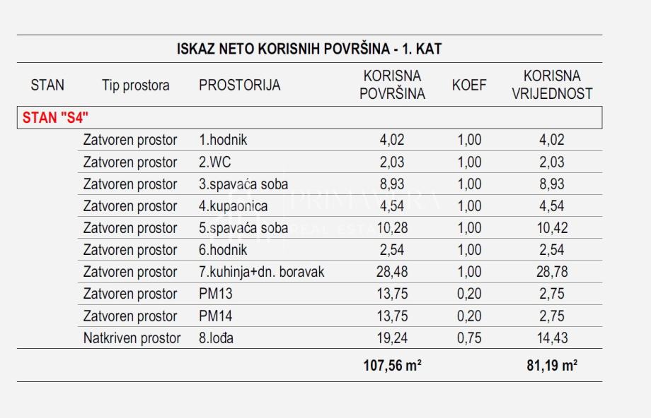 Dvosoban stan oznake S4, smješten na 1. katu zgrade, a sadrži: hodnik, wc, kupaonicu, dnevni boravak s blagovaonicom i kuhinjom, dvije spavaće sobe te lođu. Ukupna stambena površina stana iznosi 75,69 m2. Stanu pripadaju dva vanjska parkirna mjesta. Sveukupna površina stana i svih pripadaka iznosi 107,56 m2, a ukupna neto korisna površina stana i pripadaka iznosi 81,19 m2.