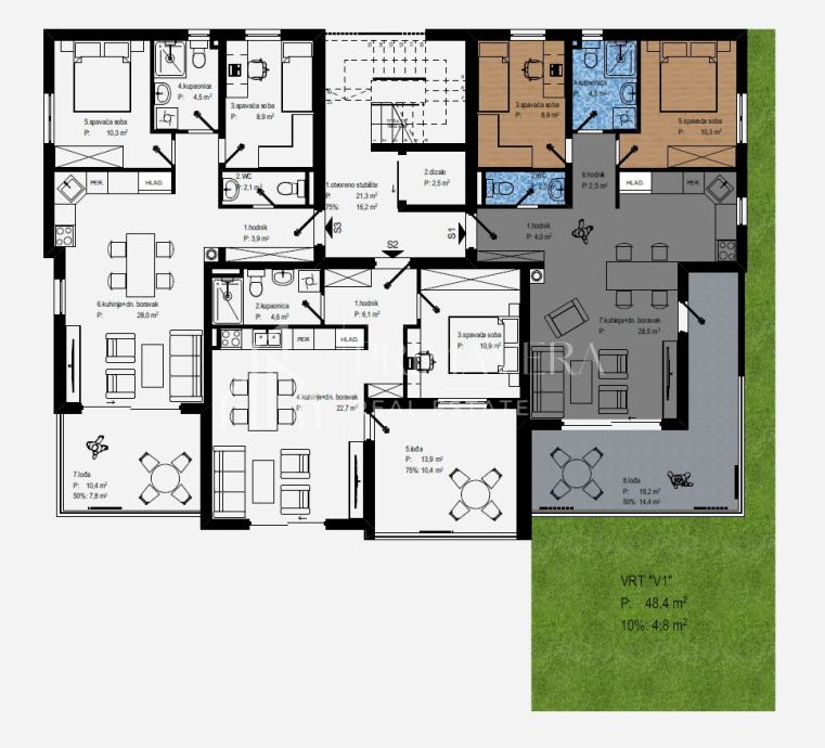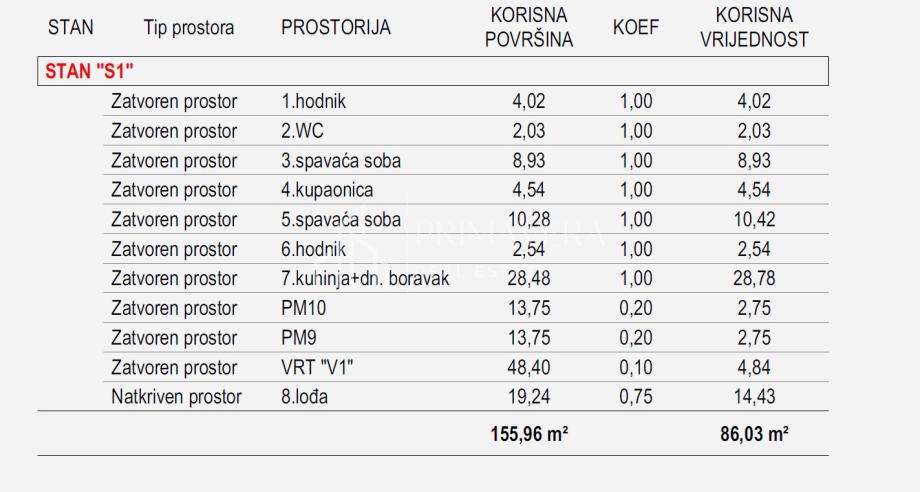 Dvosoban stan s vrtom, oznake S1, smješten na prizemlju zgrade, a sadrži: hodnik, wc, kupaonicu, dnevni boravak s blagovaonicom i kuhinjom, dvije spavaće sobe te lođu. Ukupna stambena površina stana iznosi 75,69 m2. Stanu dodatno pripada vlastiti vrt površine 48,40 m2 te dva vanjska parkirna mjesta. Sveukupna površina stana i svih pripadaka iznosi 155,96 m2, a ukupna neto korisna površina stana i pripadaka iznosi 86,03 m2.