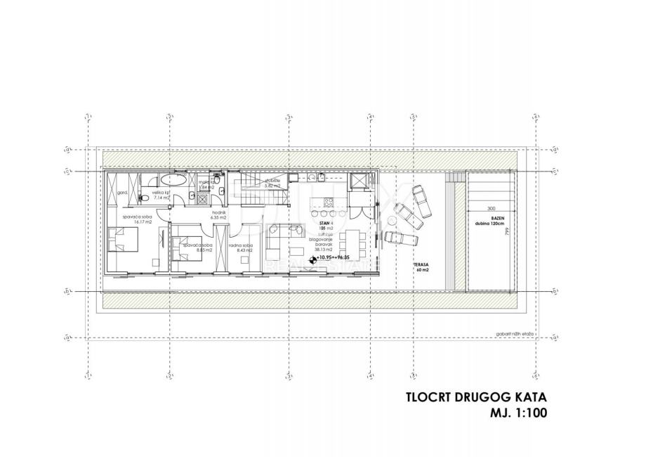 Prodaje se luksuzni stan u novogradnji na jednoj od najatraktivnijih lokacija u Zadru, na Vidikovcu. Stan s impresivnim pogledom na more i grad nalazi se na 2. katu poslovno stambene zgrade sa sveukupno 4 stambene jedinice. Stan ukupne stambene površine od 105 m2 sastoji se od dvije spavaće sobe, garderobe, jedne radne sobe, dnevnog boravka, kuhinje i blagovaonice, dvije kupaonice i prostrane terase s bazenom.