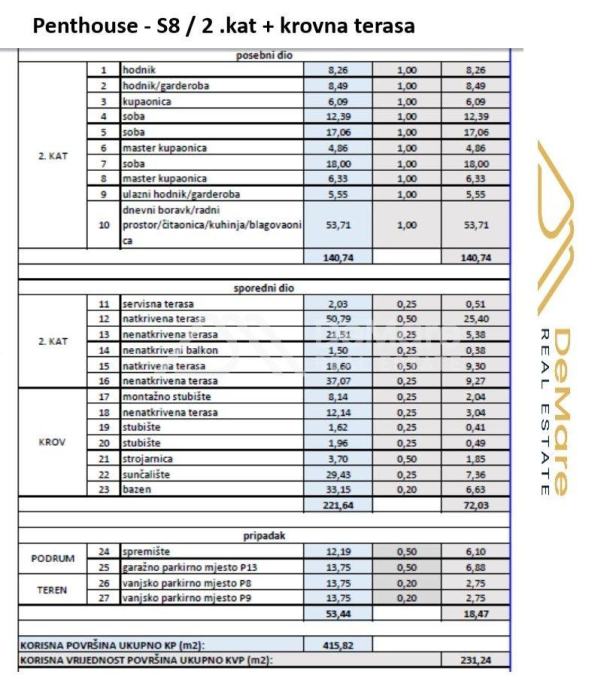 Ukupna površina stana je 415,82 m2 a obračunska vrijednost korisne površine stana iznosi 231,24 m2.