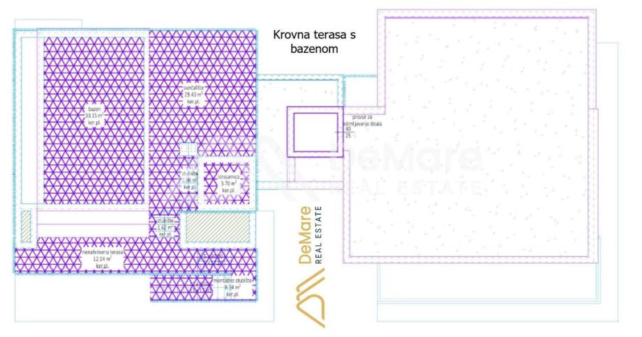 Na krovu iznad stana, nalazi se spremište i prekrasna, prostrana krovna terasa s koje se pruža panoramski pogled na more, na kojoj će se postaviti infinity bazen, sunčalište i gdje će biti ugrađeni priključci za struju i vodu, te se preostali prostor može urediti i opremiti za odmor i boravak na otvorenom, prema vlastitim željama budućih vlasnika.