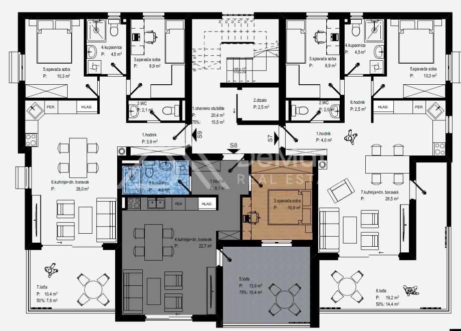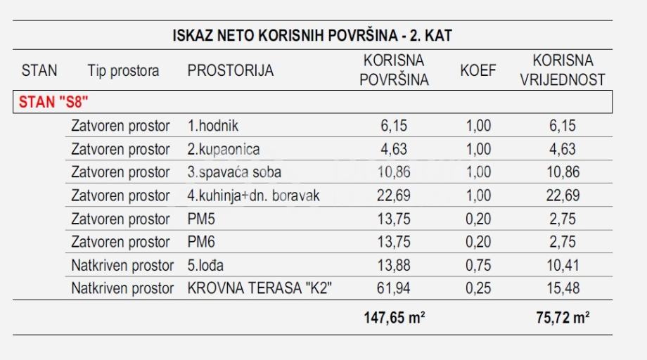 Bruto površina stana je 147,65 m2, a ukupna neto površina stana s pripadcima iznosi 75,72 m2.