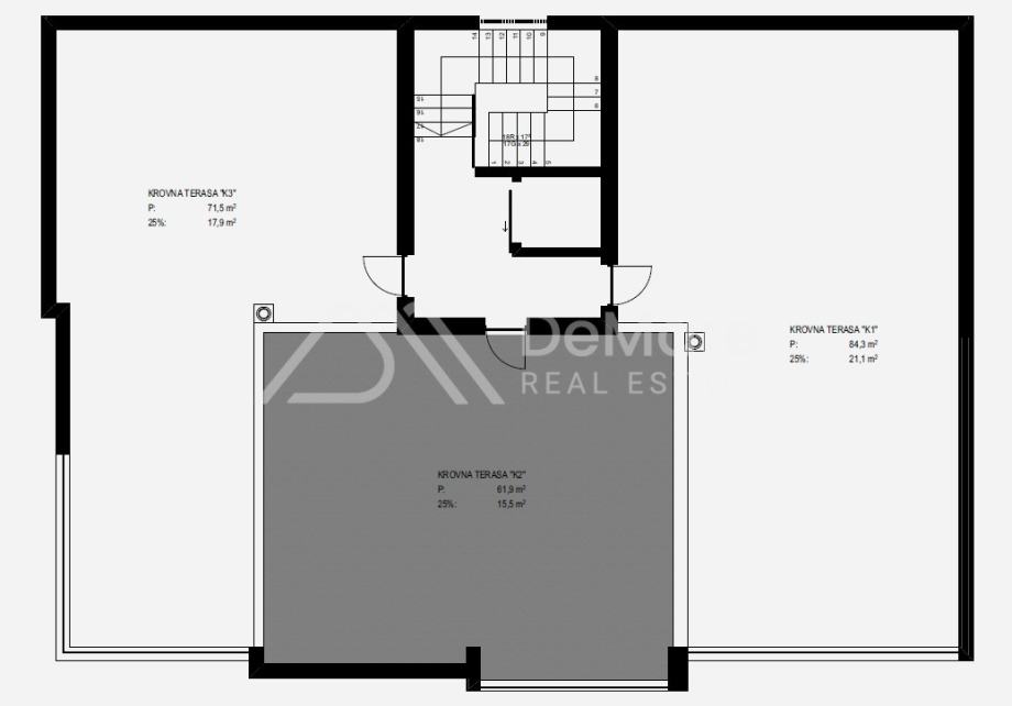 Stanu pripada prostrana krovna terasa (61,94 m2) na kojoj se mogu postaviti razni sadržaji za boravak na otvorenom, a u dvorištu zgrade se nalaze i dva vanjska parkirna mjesta (27,50 m2) koja pripadaju stanu.