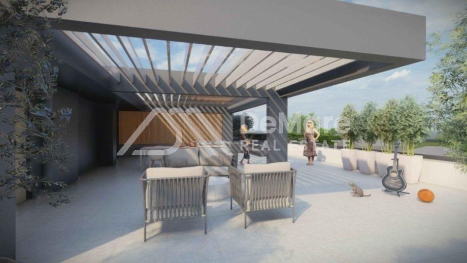 Stanu pripada loggia (2,45 m2) i natkrivena terasa (4,94 m2), 2 garažna parkirna mjesta (14,10 m2 i 17,86 m2 ) i spremište (5,16 m2) u podrumu zgrade, a na krovu je prekrasna krovna terasa (69,30 m2) s panoramskim pogledom na more.