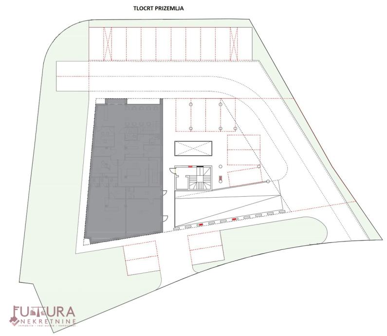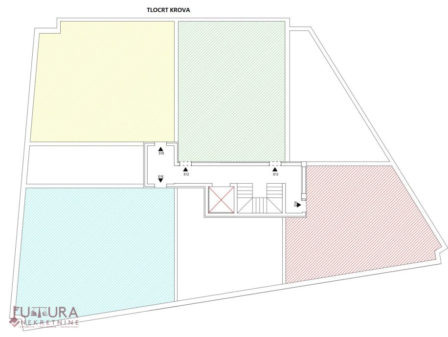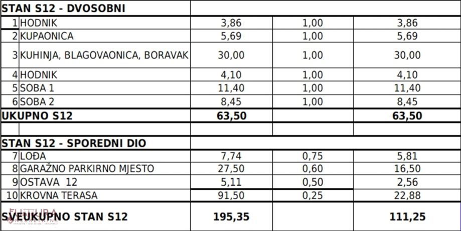 Posjeduje garažno parkirno mjesto, krovnu terasu od 91,05 m2 i ostavu.