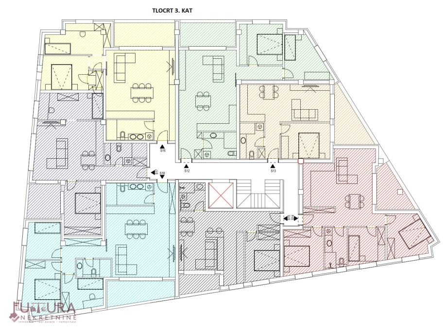 Sastoji se od: tri spavaće sobe, dnevnog boravka + kuhinja + blagovaona, hodnika, kupaonice i lođe.