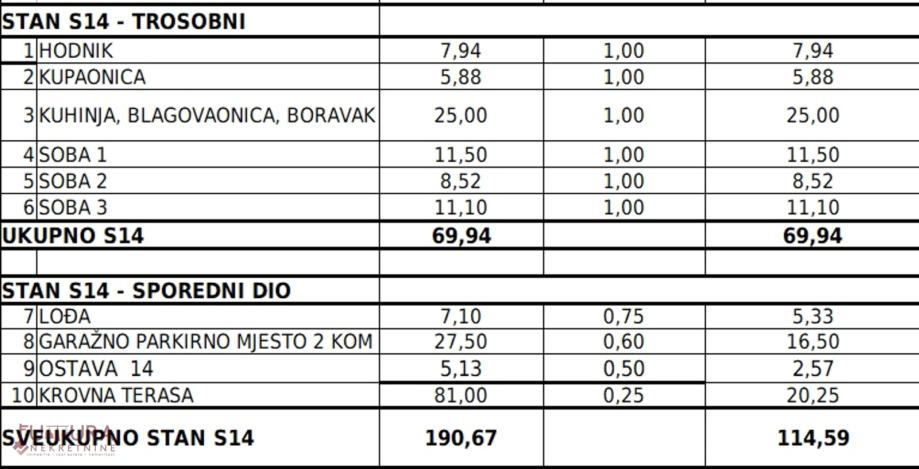 Posjeduje dva garažna parkirna mjesta, krovnu terasu od 81 m2 i ostavu.