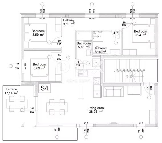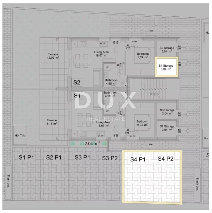 U ponudi je stan BS4 na drugom katu zgrade B – prostrani stan koji se sastoji od tri spavaće sobe, dvije kupaonice, velikog dnevnog boravka, kuhinje s blagovaonicom, hodnika, natkrivene terase s prekrasnim pogledom na more te krovne terase koja također pruža očaravajući panoramski pogled. Stan ima vlastito spremište i dva vlastita parkirna mjesta