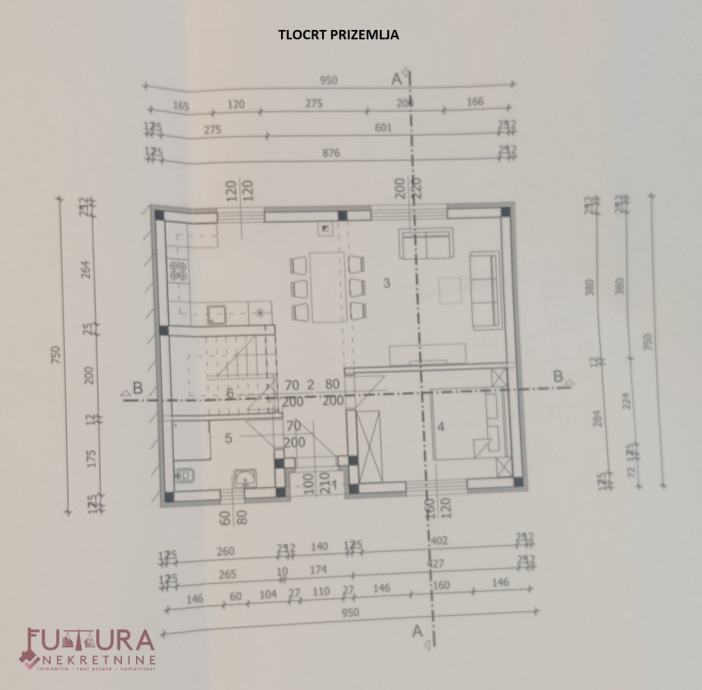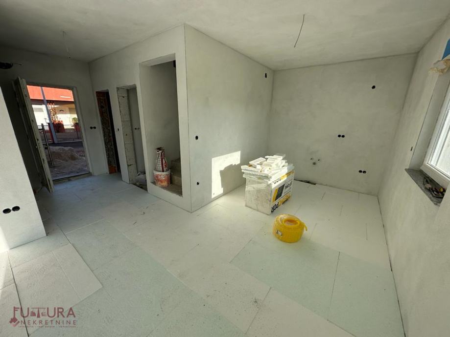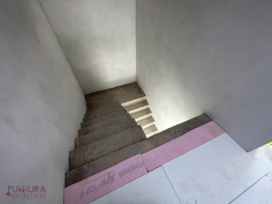 - prizemlje: jedna spavaća soba, dnevni boravak + kuhinja + blagovaona, kupaonica, spremište i terasa.
