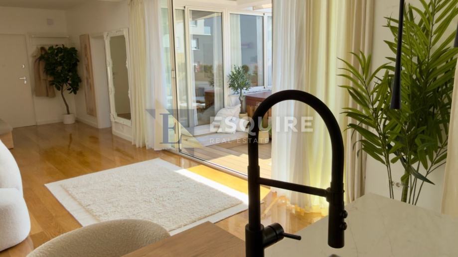 Središnji dio stana čini prostrani dnevni boravak s modernim kaminom. Kuhinja Nolte Küchen izrađena je po mjeri i opremljena vrhunskim aparatima brendova Miele, Liebherr i Bosch (vinska vitrina, ugradbeni aparat za kavu, ledomat i najnovija generacija uređaja).