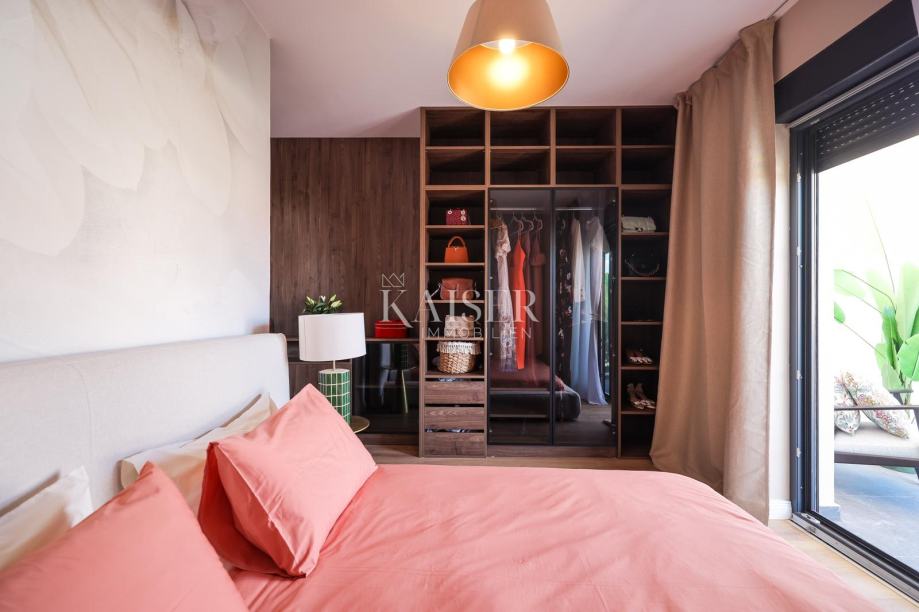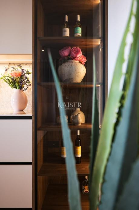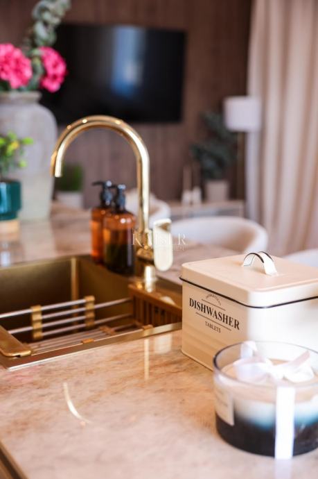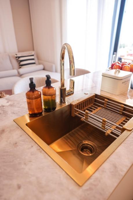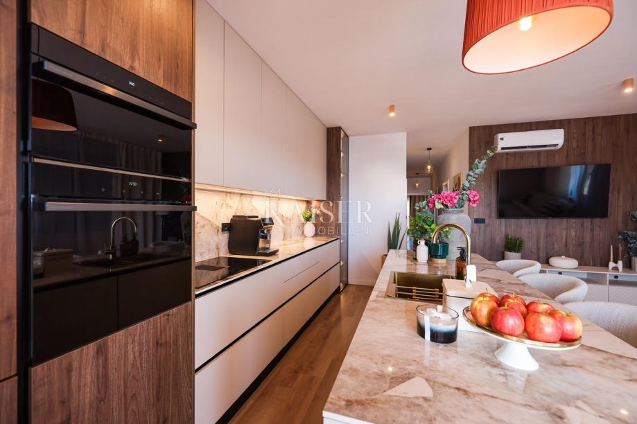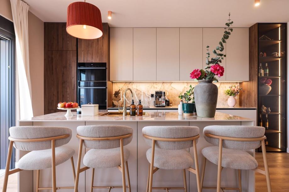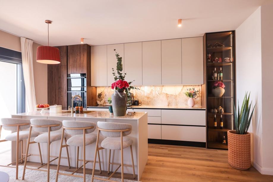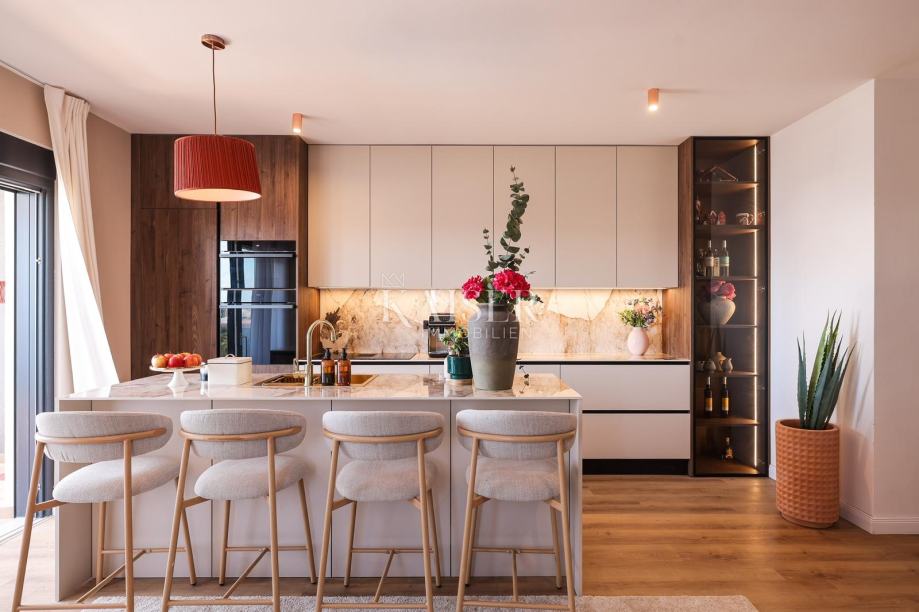 Smješten na posljednjem katu zgrade s liftom, stan je dizajniran s posebnom pažnjom na svaki detalj, odišući elegantnim, suvremenim stilom uređenja i vrhunskom kvalitetom. Otvoreni dnevni boravak s kuhinjom i blagovaonicom ispunjen je prirodnim svjetlom zahvaljujući velikim staklenim stijenkama koje vode na terasu s prekrasnim pogledom. Kuhinja je opremljena najmodernijim uređajima, a radne plohe izrađene su od visokokvalitetnih materijala koji objedinjuju estetiku i funkcionalnost.