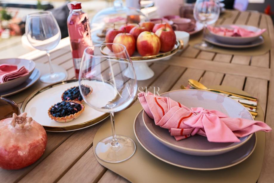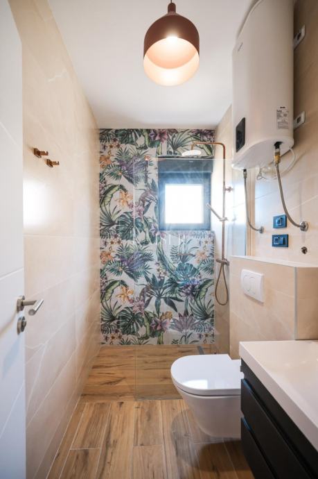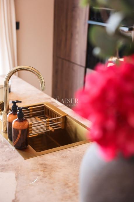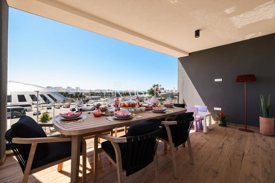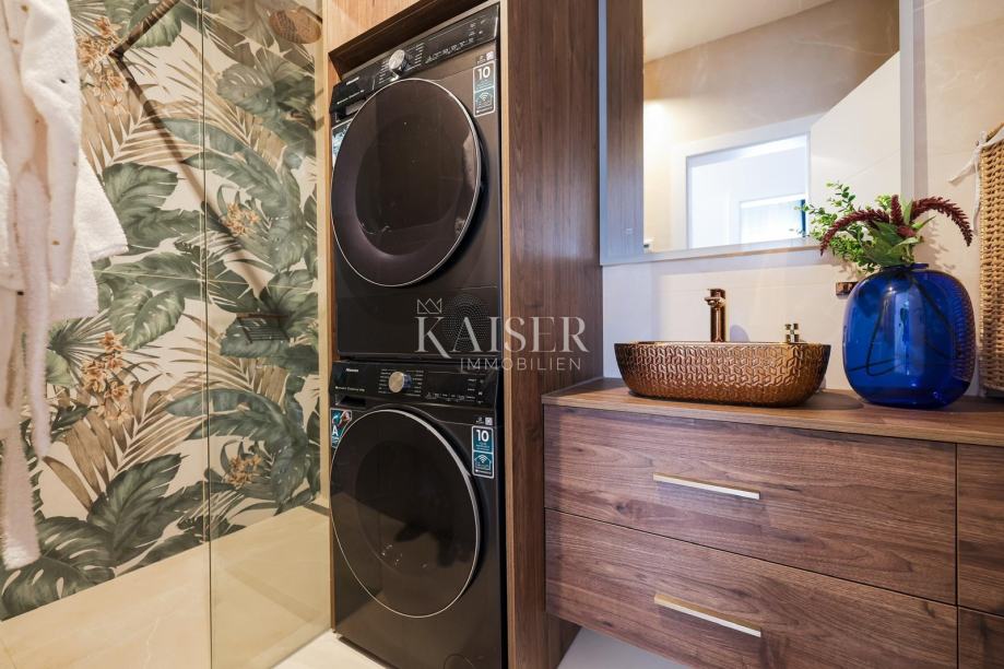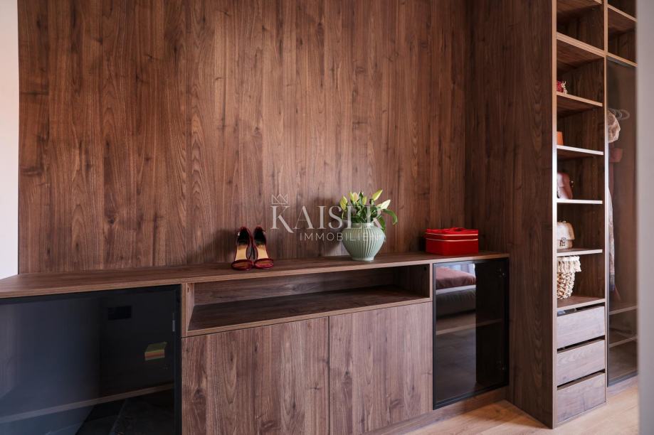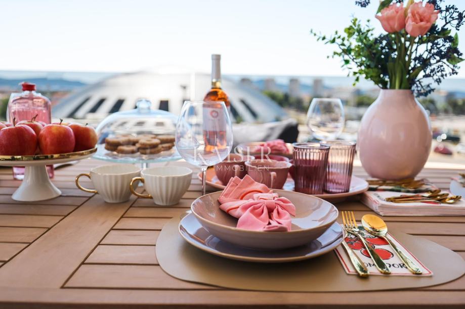 Smješten na posljednjem katu zgrade s liftom, stan je dizajniran s posebnom pažnjom na svaki detalj, odišući elegantnim, suvremenim stilom uređenja i vrhunskom kvalitetom. Otvoreni dnevni boravak s kuhinjom i blagovaonicom ispunjen je prirodnim svjetlom zahvaljujući velikim staklenim stijenkama koje vode na terasu s prekrasnim pogledom. Kuhinja je opremljena najmodernijim uređajima, a radne plohe izrađene su od visokokvalitetnih materijala koji objedinjuju estetiku i funkcionalnost.