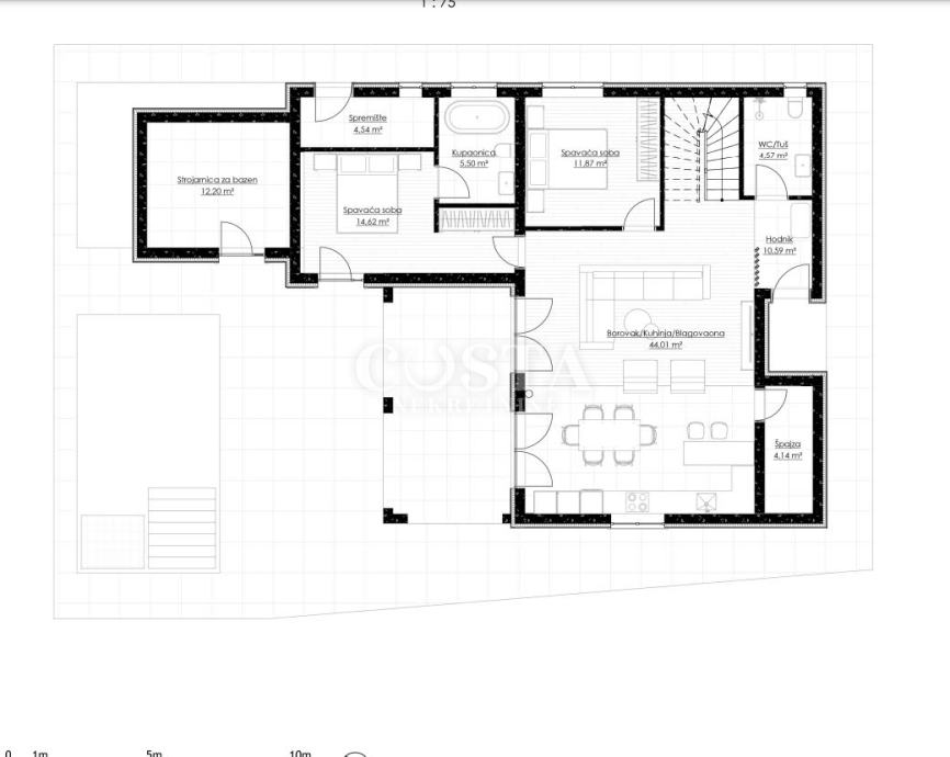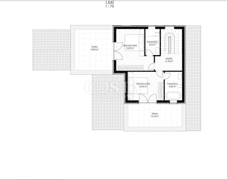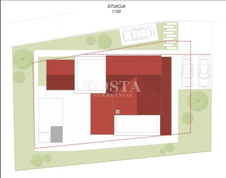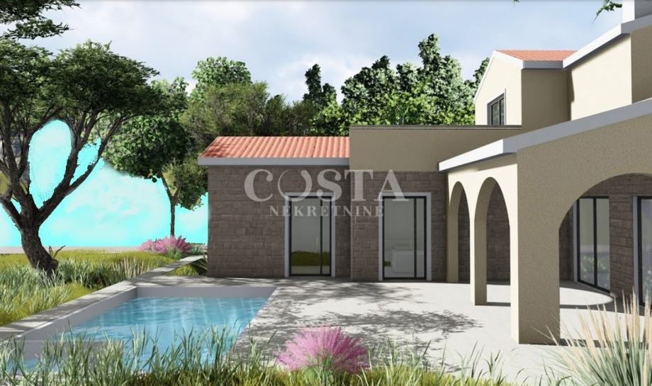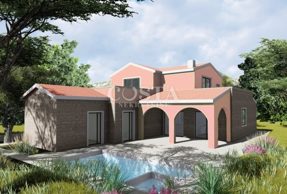 Prema projektu planirana je gradnja katnice od 210 m2. U prizemlju su dnevni boravak, kuhinja i blagovaona, dvije spavaće sobe, kupaonica, ostava i dodatni wc. U dvorištu je predviđen bazen od 24 m2. Na katu kuće su dvije spavaće sobe s pripadajućim kupaonicama i terasom. Plaćeni su priključci struje.