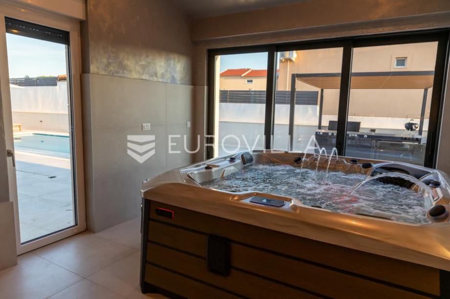 Zadar, Vrsi, samostojeća kuća s dvorištem bazenom nalazi se na zemljištu površine 682 m2.Sastoji se od dvije etaže, prizemlja i prvog kata koji su međusobno povezani unutarnjim stubištem.Prizemlje se sastoji od ulaznog prostora, welness prostora, spavaće sobe, kupaonice, gostinjskog...