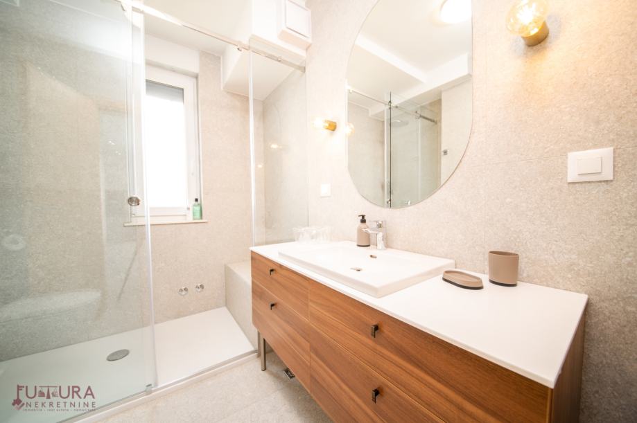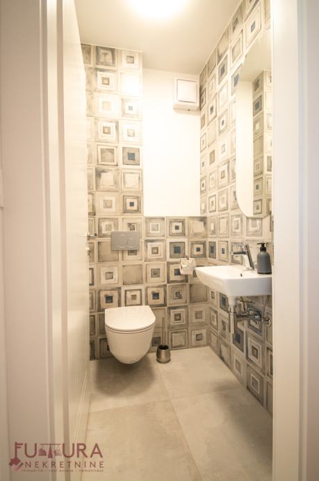 Podrum: teretana, priprema za saunu i wellness zonu, praona sa perilicom rublja, sušilicom i ormarom sa svom potrebnom posteljinom, wc i strojarnica s bojlerom, centralna priprema tople vode putem solarnih panela 500 l Viessmann rezervoara, čija tehnologija onemogućava pregrijavanje, u slučaju nedostatka sunca, u rezervoar je ugrađen 6KW grijač.