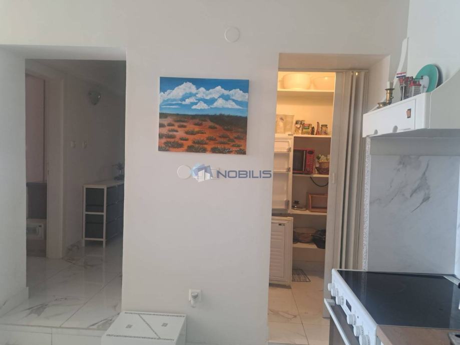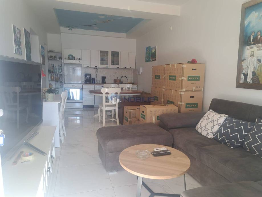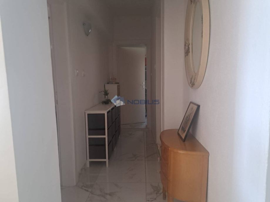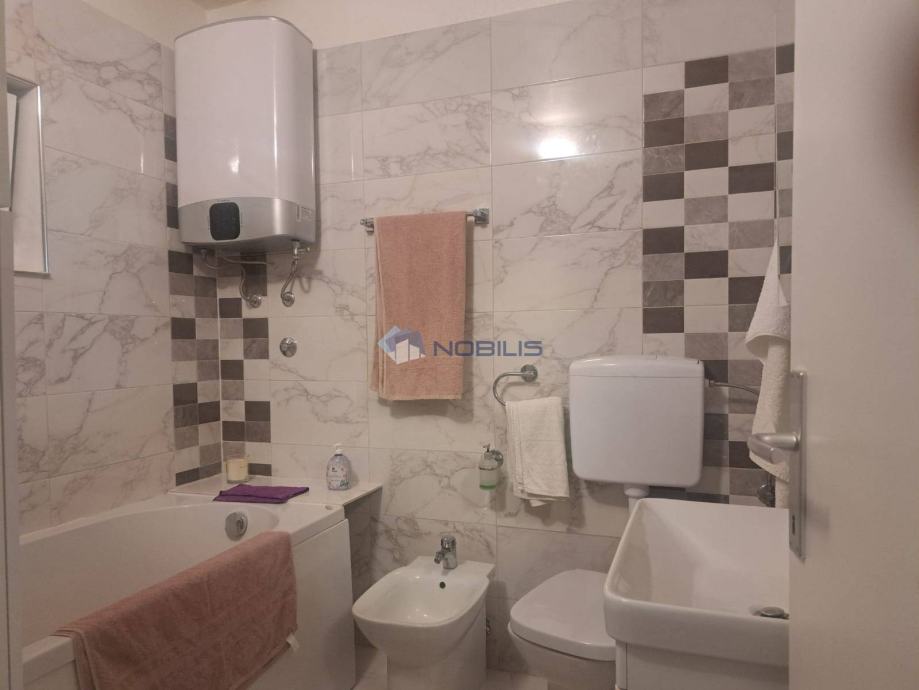 Stan se nalazi u prizemlju stambeno-poslovne zgrade. Površine oko 85 m2 plus pripadajuća terasa. Stan ima prekrasnu kuhinju koja je povezana sa dnevnim boravkom- U kuhinji ima posebna manja prostorija za skladištenje namirnica. S lijeve strane dnevnog boravka proteže se veliki hodnik. S lijeve strane hodnika velika spavaća soba sa ugradbenim ormarom. S desne strane hodnika se nalazi zasebno kupaonica sa kadom i zasebno wc. Na kraju hodnika se proteže zasebna prostorija koju suvlasnica koristi za čuvanje osobnih stvari (može se koristiti kao2. spavaća soba). Ovom apartmanu pripada prostorija od 18m2 koju je vlasnica zamislila ostakliti.- sun room, Apartman je potpuno namješten i kao takav se prodaje (osim osobnih stvari). Navedeni apartman se vodi kao poslovni prostor.