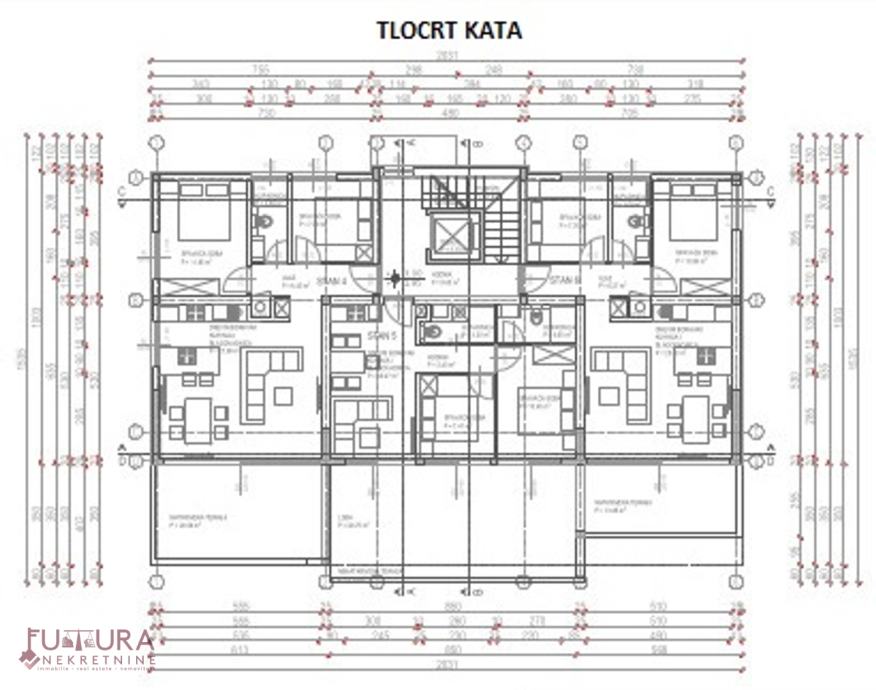 Sastoji se od: dvije spavaće sobe, dnevnog boravka + kuhinja + blagovaona, hodnika, kupaonice i terase.