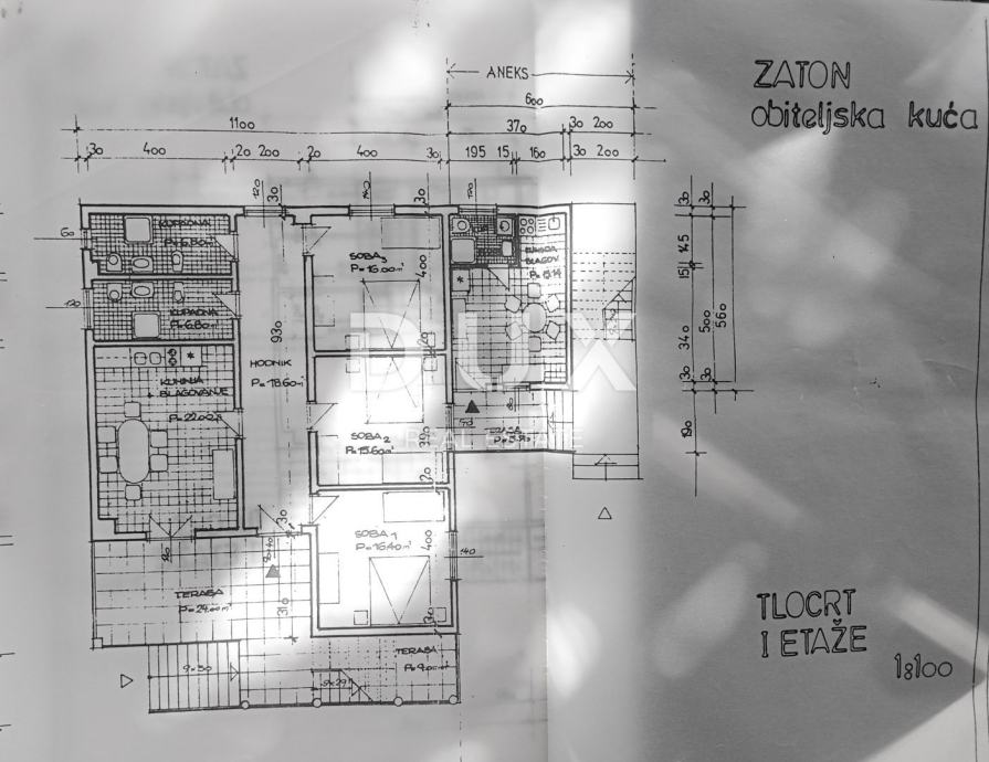 Prodaje se prostrana apartmanska vila u mjestu Zaton pokraj Zadra. Ukupne stambene površine 396,10 m2, vila je izgrađena na parceli od 626 m2 koja sveukupno broji pet apartmana sa zasebnim ulazima. Sastoji se od podruma, prizemlja kata i potkrovlja. U podrumu se nalazi garaža, te ljetna kuhinja i alatnica. U prizemlju nalazi se jedan trosobni apartman s prostranom terasom na ulazu, dnevnim boravkom i kuhinjom te dvije kupaonice. S bočne strane je zaseban ulaz u jednosobni apartman na dvije etaže koji također ima terasu. Na prvom katu nalazi se trosobni apartman, a u potkrovlju dva dvosobna apartmana s pripadajućim terasama s kojih se pruža prekrasan pogled na more. U dvorištu se nalazi i lounge prostor s roštiljem te uređeni vrt i dječje igralište. Osim garaže, u dvorištu je dostupan privatni parking s dodatna dva parkirna mjesta.