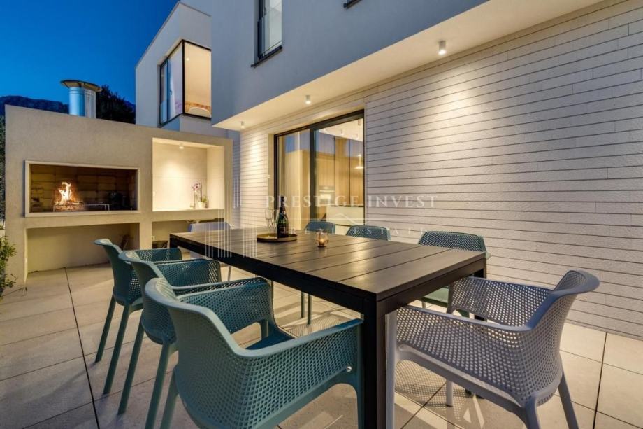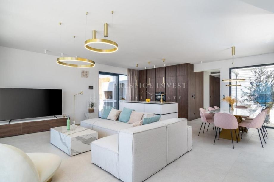 Vila se prostire na zemljištu od 800m2 s 285m2 stambene površine raspoređene na tri etaže. Prizemlje- open space sadrži luksuznu kuhinju sa spojenom blagovaonicom i prostranim dnevnim boravkom koji vodi na prostranu terasu s hidromasažnim bazenom od 35m2, roštiljem i vrtom, te toaleta, praonice i dodatnog spremišta.
