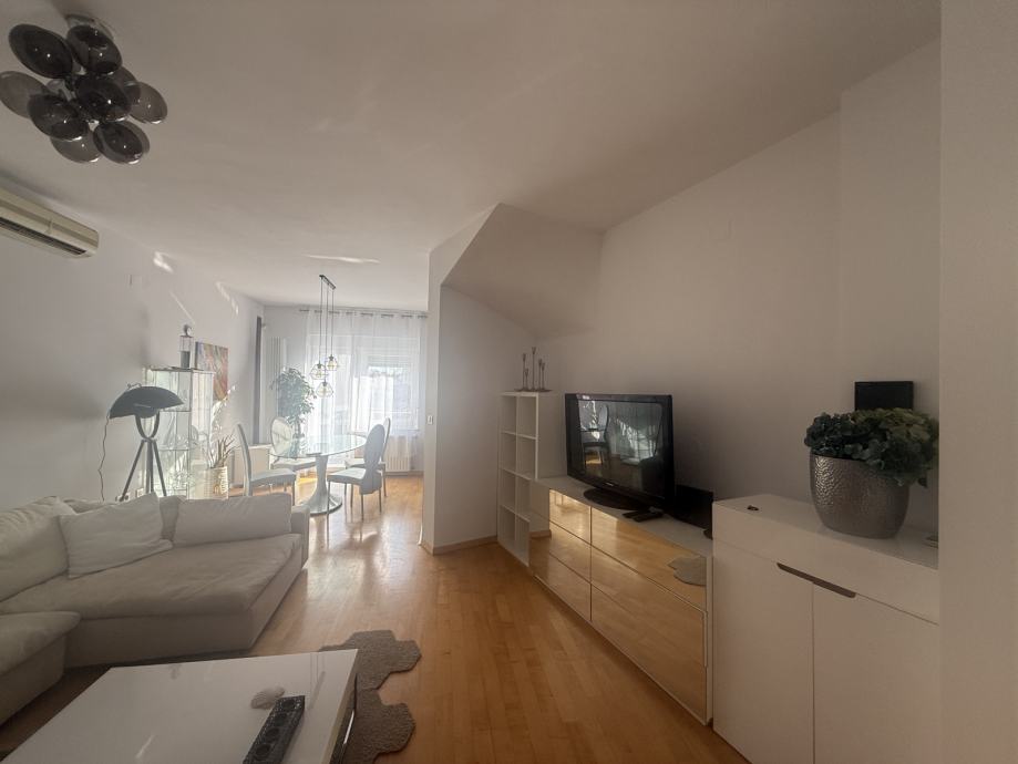 Iznajmljuje se potpuno namješten i opremljen stan površine 95 m², smješten na prvom katu stambene zgrade u ulici Božidara Adžije, u atraktivnom dijelu Trešnjevke sjever, Zagreb.