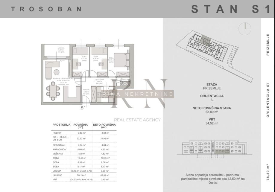 Stan se nalazi na prizemlju, netto površine 68.89 m2 + loggia (brutto 5,20 m2) + vrt (brutto 34.52), ukupno obračunato 72.34 m2 netto.