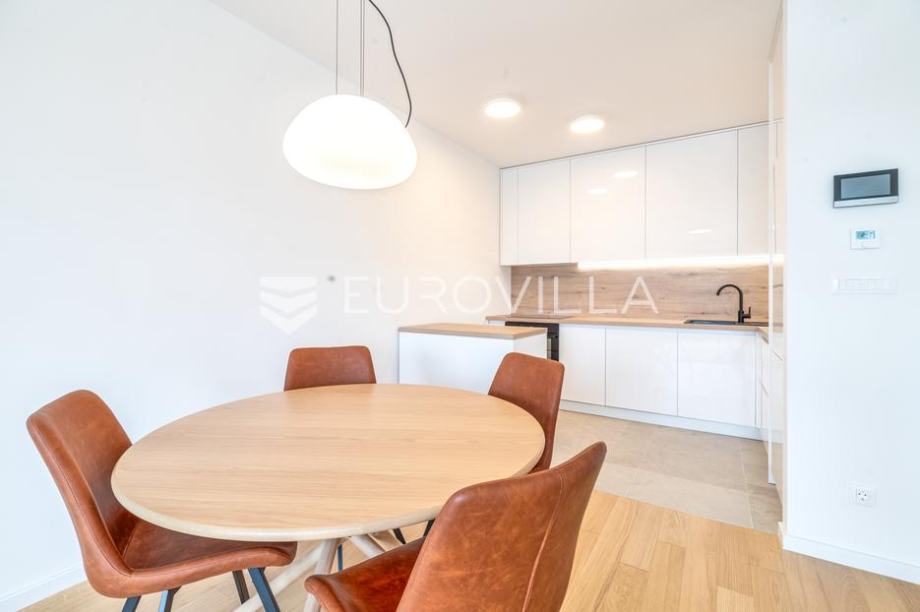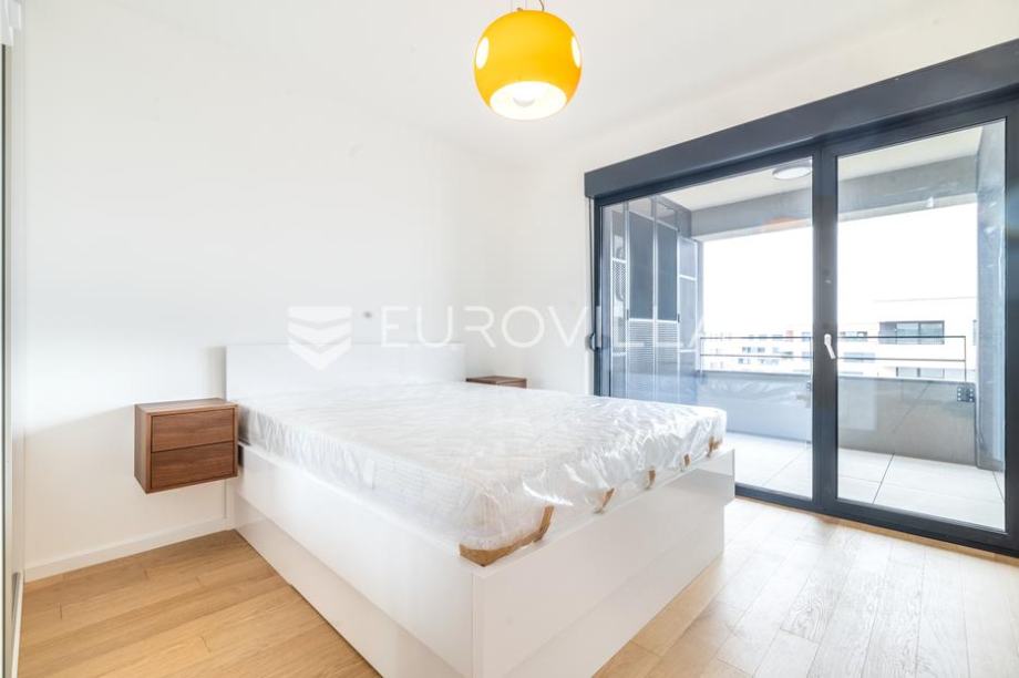 Novi Zagreb, Blato, modern one-bedroom apartment on the fifth floor of a new building with an elevator.It consists of a spacious hallway with built-in wardrobes, a bathroom with a bathtub, a bedroom with built-in wardrobes, an open-space kitchen, dining room and living room, and a loggia with a...