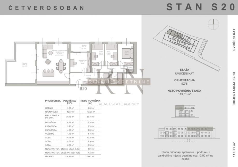 Stan se nalazi na drugom katu od dva u zgradi sa dizalom, netto površine 104.63m2 + terasa 1 (brutto 29.26m2) + terasa 2 (brutto 4.23m2), ukupno obračunato 113.01 m2 netto.