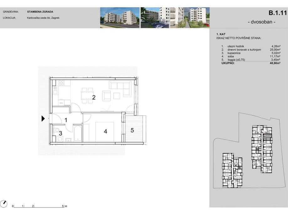 Stan oznake B.1.11, dvosoban, nalazi se na 1. katu te se sastoji od: hodnika, dnevnog boravka sa kuhinjom i blagovaonicom, kupaonice, sobe i lođe, ukupne prodajne površine 48,90m2.