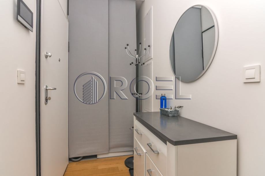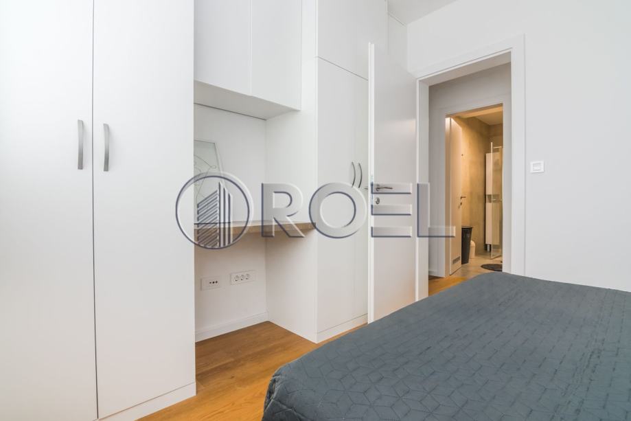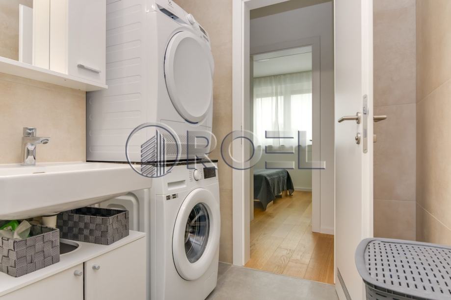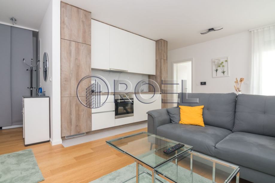 Stan se sastoji od dnevnog boravka s kuhinjom i blagovaonicom, dvije spavaće sobe, kupaonice, balkona i pripadajućeg parkirnog mjesta. Grijanje je podno, a stan je opremljen perilicom i sušilicom rublja, te se iznajmljuje u potpunosti namješten.