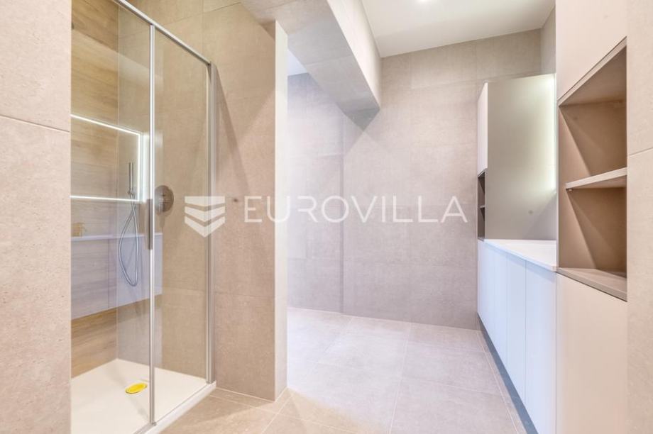 Na donjoj etaži nalazi se dnevni boravak s kuhinjom, blagovaonicom i izlazom na terasu, dvije spavaće sobe od kojih je jedna master s vlastitom kupaonicom i walk-in ormarom, dodatne kupaonice, vešeraja i ostave.