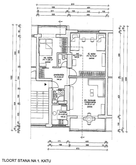 Stan je moderno uređen i potpuno renoviran 2011-te godine, promijenjene su sve cijevi, stolarija, parket, itd., orijentacija je istok/zapad. Nalazi se na prvom katu stambene zgrade građene 1960-te godine, masivna nosiva konstrukcija, temelji su betonski trakasti, nosivi zidovi su od opeke i armiranog betona debljine 38 i 30 cm.