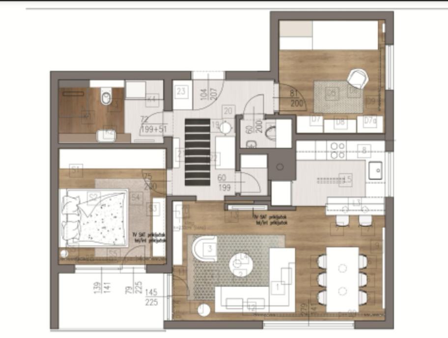 Sastoji se od ulaznog hodnika open-space koncepta dnevnog boravka, blagovaonice i kuhinje, dvije spavaće sobe, kupaonice, gostinjskog toaleta te zatvorene lođe.
