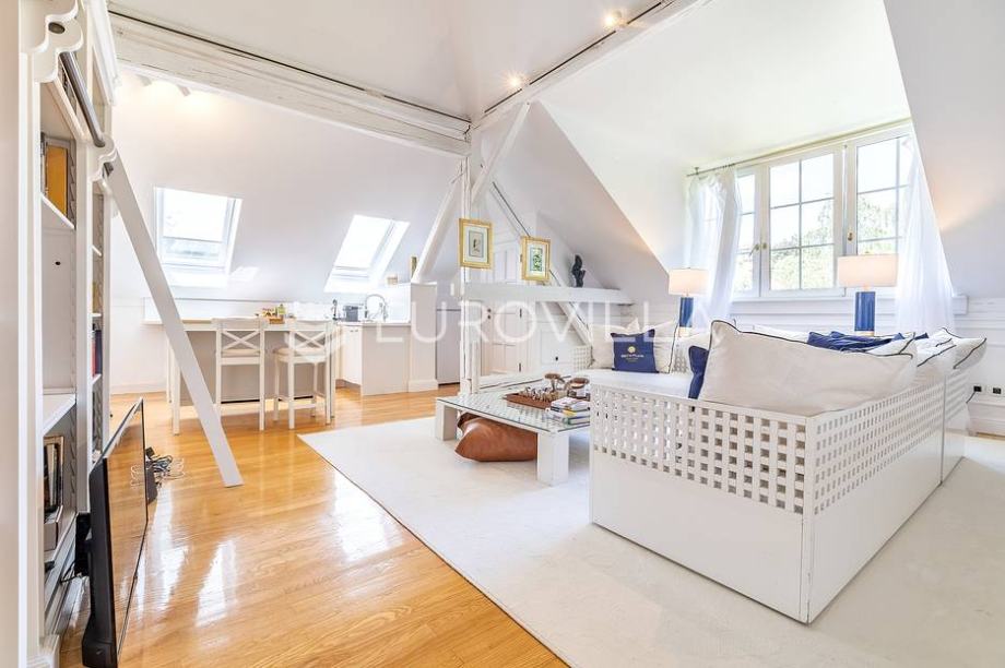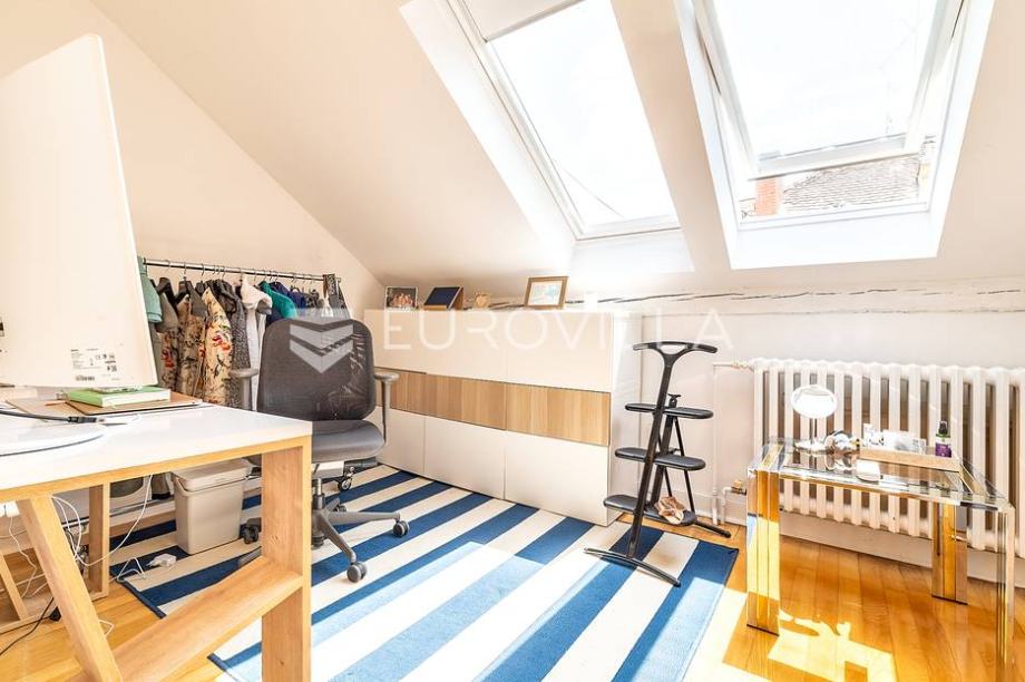 Zagreb, Bosanska ulica, trosoban stan u potkrovlju, površine 102m2. Sastoji se od ulaznog prostora, dvije spavaće sobe, otvorenog dnevnog boravka s kuhinjom i blagovaonicom, kupaonice, toaleta i garderobe. U stanu su i dvije manje galerije koje se mogu koristiti kao spremište.Zgrada u kojoj se...