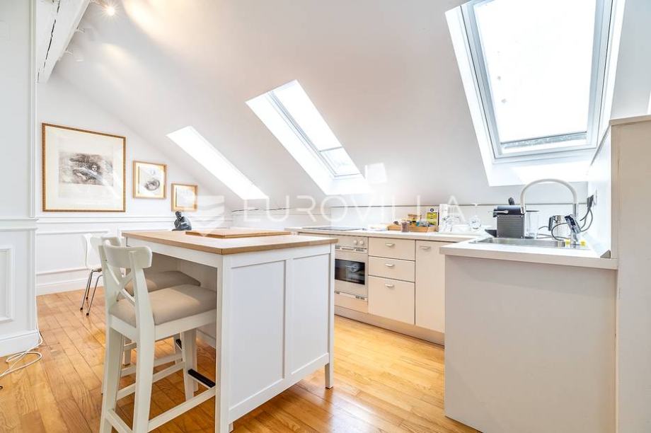 Zagreb, Bosanska street, three-room apartment in the attic, surface area 102m2. It consists of an entrance area, two bedrooms, an open living room with kitchen and dining room, bathroom, toilet and a wardrobe. The apartment also has two smaller galleries that can be used as storage.The building in...