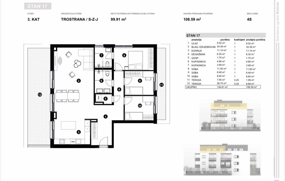 Na vrhu zgrade smještena su samo dva penthouse stana, osmišljena za maksimalan mir i privatnost. Velike terase, otvoreni pogledi i odsustvo susjeda iznad stvaraju jedinstven osjećaj luksuza i ekskluzivnog stanovanja, pružajući budućim vlasnicima vrhunski komfor i poseban doživljaj doma. Četverosoban penthouse S17 NKP 108,59 m2 se tlocrtno sastoji od ulaznog hodnka, 3 spavaće sobe, dnevnog boravka s blagovaonicom, kuhinje, ostave, degažmana, dvije kupaonice te dvije terase.