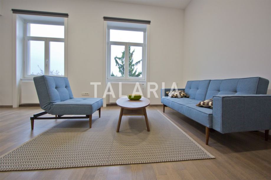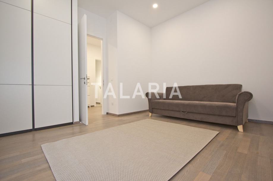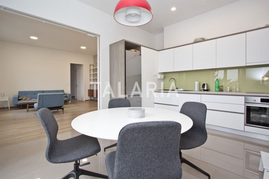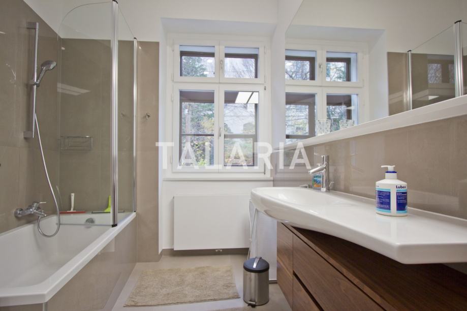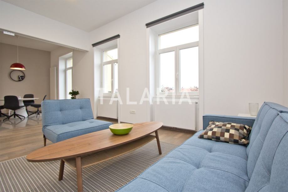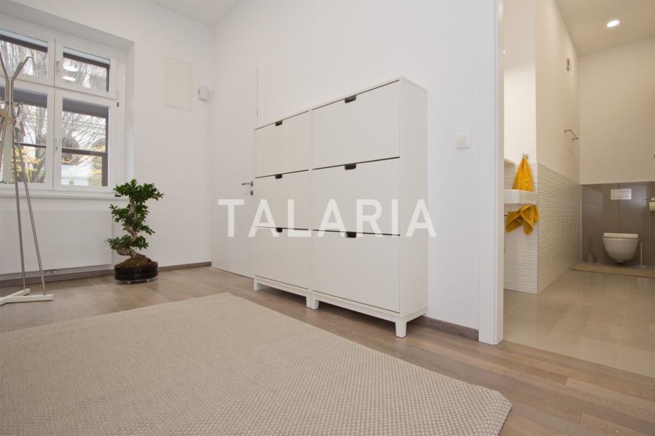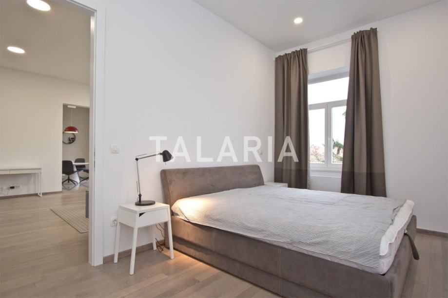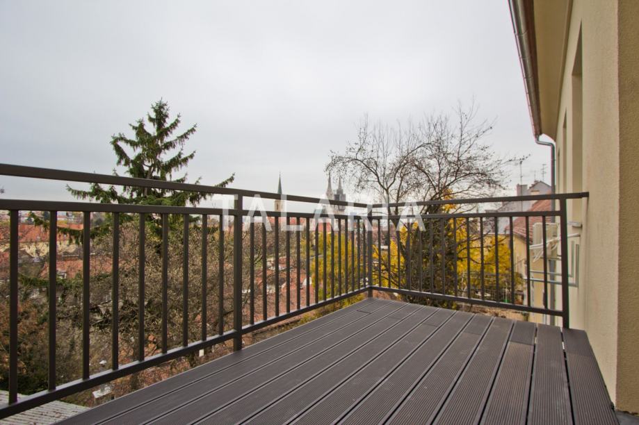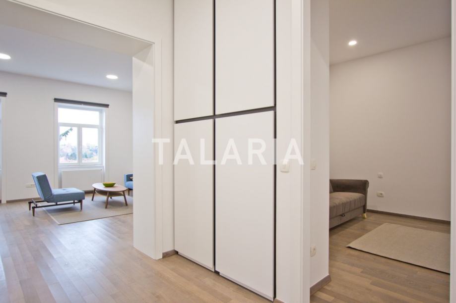 Estetski odmjeren, luksuzno opremljen, neutralnog interijera iz kojeg odiše jednostavnost i praktičnost. Trosoban stan odličnog i promišljenog tlocrta! Čine ga prostran hodnik s velikom garderobom,dupla "bogata vrata" vode prema velikom dnevnom boravku s radnim prostorom, kuhinja s blagovaonom koja se nastavlja na terasu (predivan pogled na zelenilo i katedralu), glavna spavaća soba s garderobom i lijepom kupaonom (kada) te druga spavaća s pripadajućom kupaonom (tuš). Kuhinja se po potrebi zatvara velikom staklenom kliznom stijenom. Odličan izbor za strance koji namjeravaju istraživati Zagreb i vole biti u centru svih zbivanja.